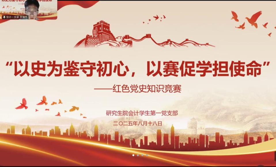 为深入学习党史知识,传承红色基因,强化党员的责任担当,研究生院会计学生第一党支部于2025年8月18日举办了以“以史为鉴守初心,以赛促学担使命”为主题的党史知识竞赛。